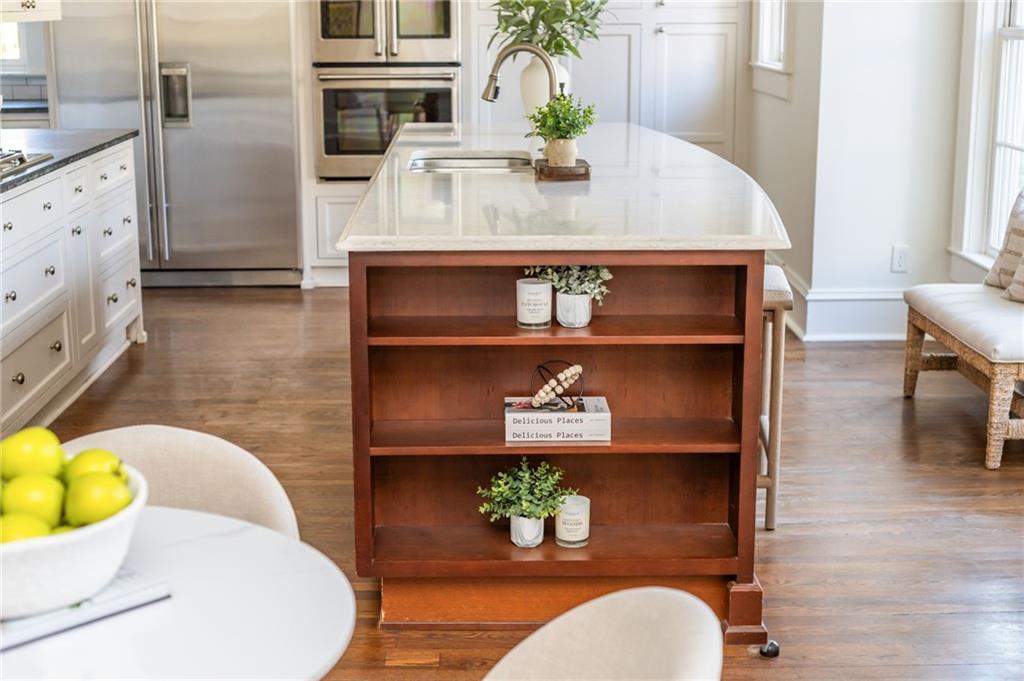 - KitchenCabinets Stain, Cabinets White, Eat-in Kitchen, Kitchen Island, Pantry, Stone Counters, View to Family Room